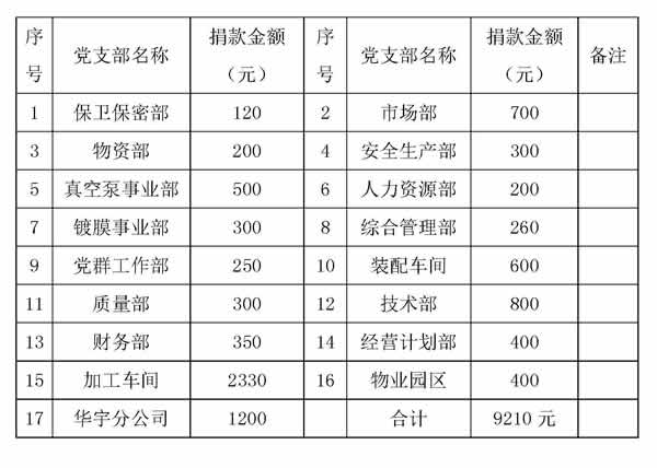 公司17個(gè)黨支部共捐款合計(jì)9210元(玖仟貳佰壹拾元整),黨群工作部已將全部捐款上繳。各支部捐款明細(xì)如下: